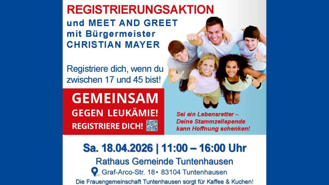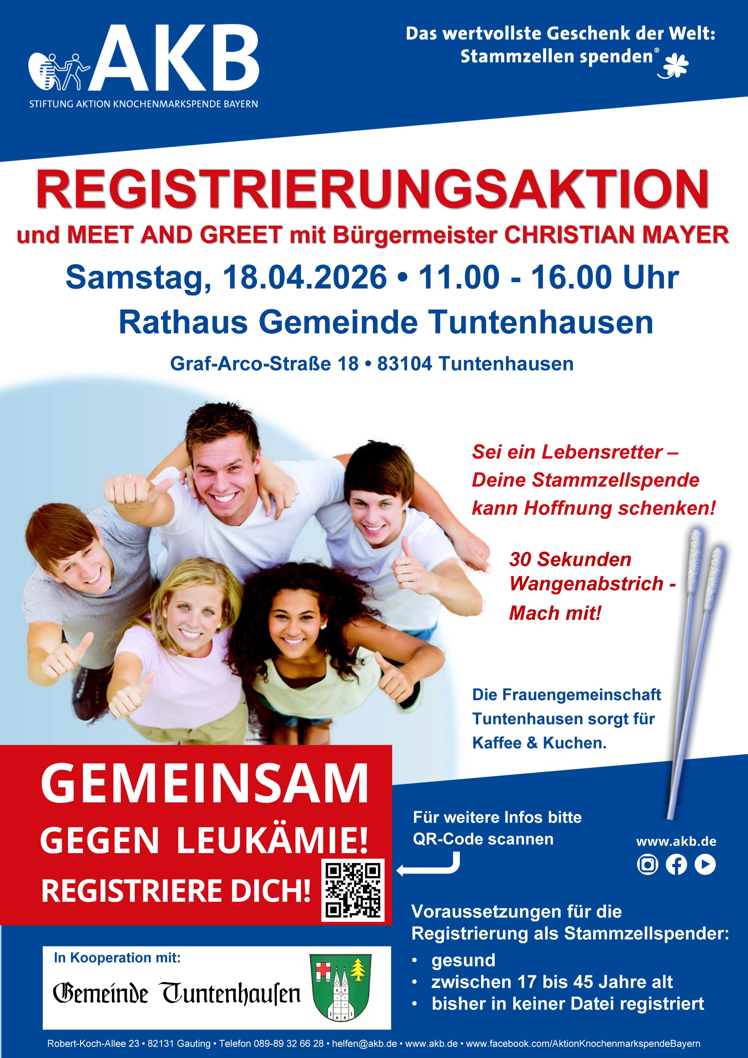 Am 18.04.2026 findet im Rathaus der Gemeinde Tuntenhausen (Graf-Arco-Straße 18, 83104 Tuntenhausen) von 11.00 bis 16.00 Uhr eine Registrierungsaktion statt, bei der sich alle gesunden Personen zwischen 17 und 45 Jahren in die Spenderdatei der Stiftung AKB aufnehmen lassen können. Ganz einfach per Wangenabstrich!