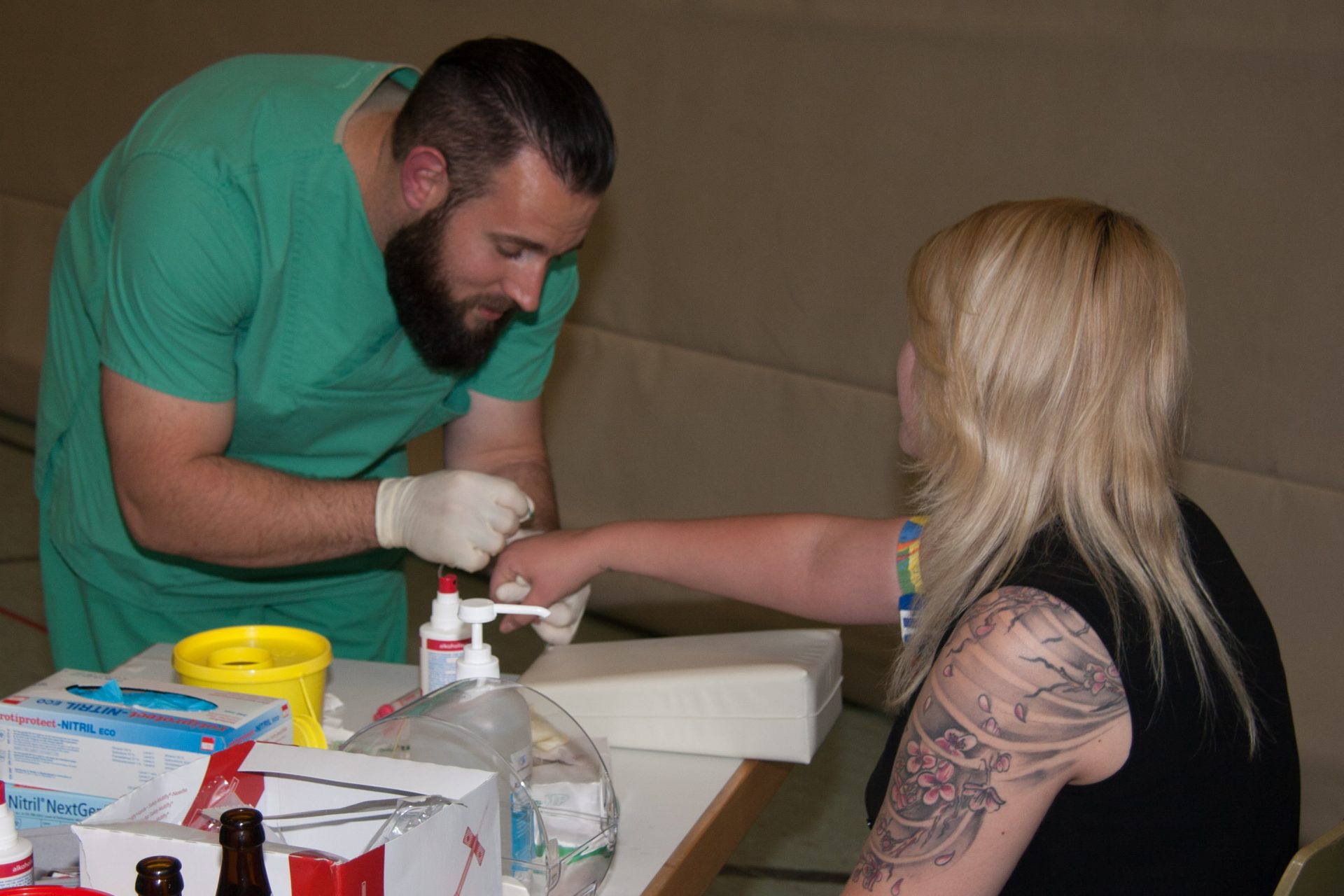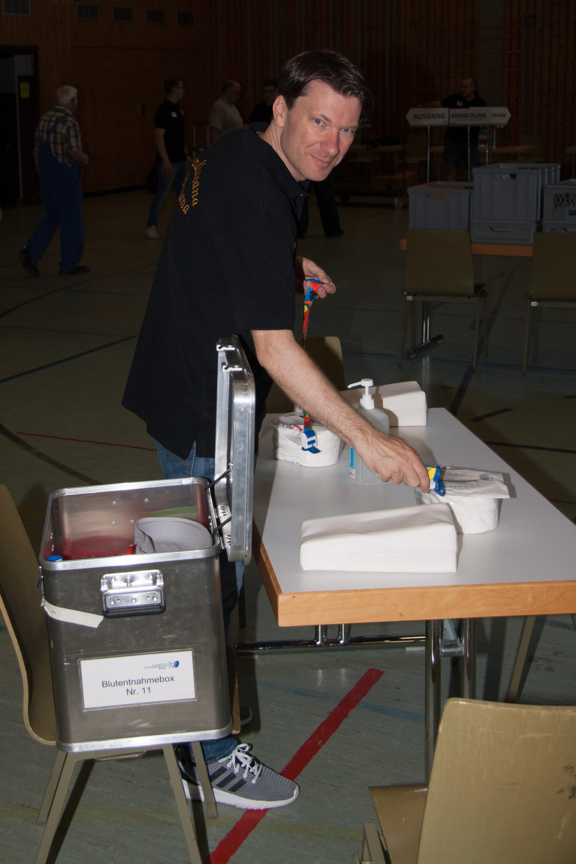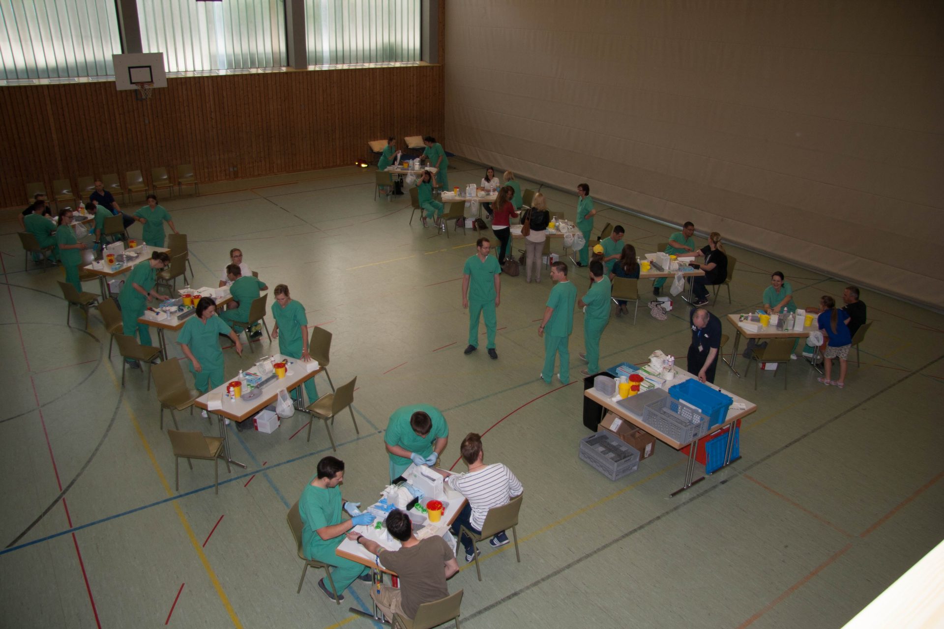 Schon um 10.30 Uhr standen die ersten Freiwilligen an den Infoständen, die sich für Benedikt und viele andere schwerkranke Patienten registrieren lassen wollten. Um 10.40 Uhr konnte gestartet werden und um 11.00 Uhr waren schon die ersten 70 potenziellen Spender registriert. Der Strom der Freiwilligen ebbte nur um die Mittagszeit kurz ab, um dann aber am Nachmittag wieder erneut aufzublühen. Mit 14 Registrierungsstationen und 20 Blutabnahmeplätzen wurde dem Ansturm aber standgehalten (wie die Filme unterstreichen), so dass es zu keinen nennenswerten Wartezeiten kam und der reibungslose Ablauf permanent sichergestellt werden konnte.