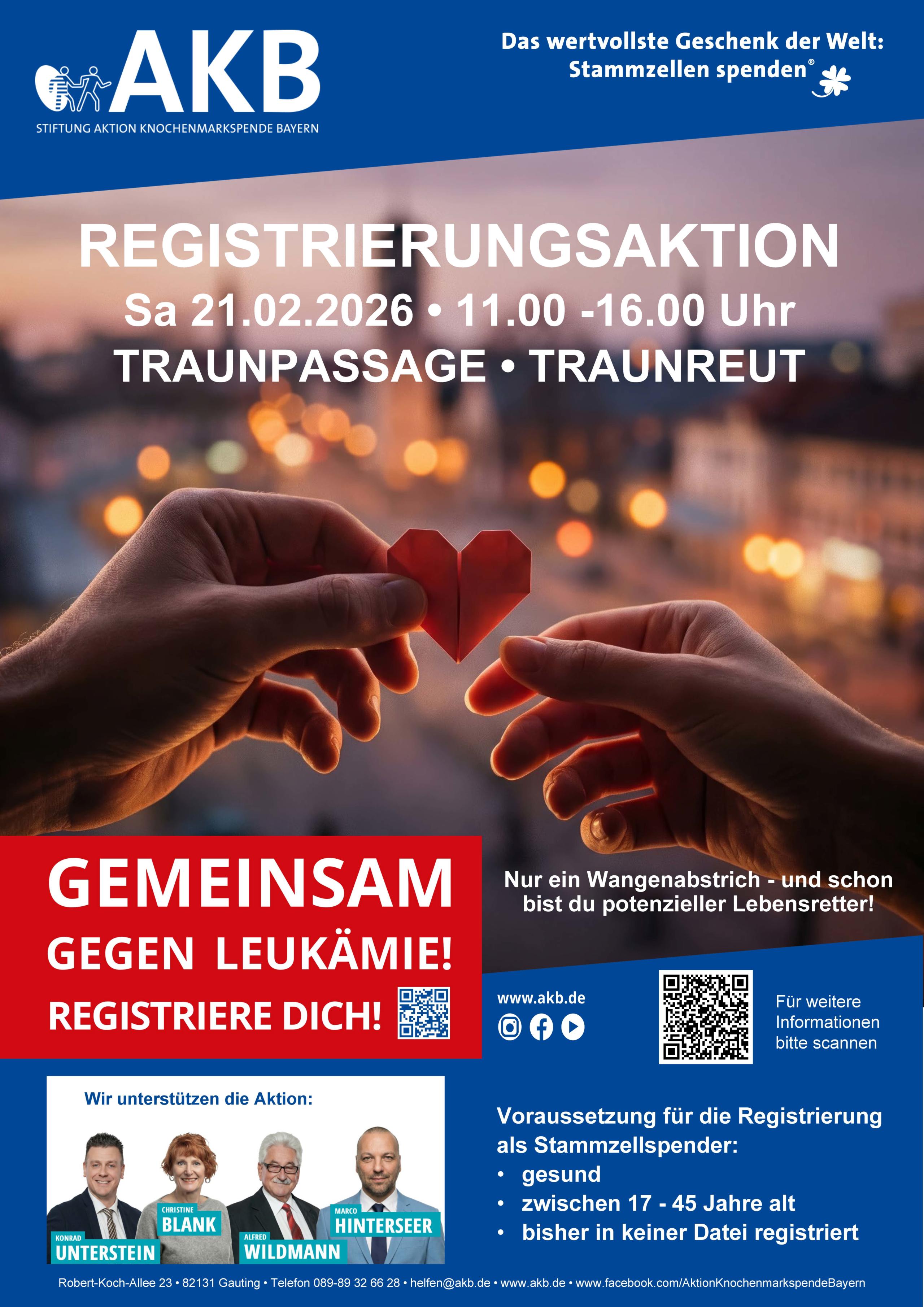 Am 21.02.2026 findet von 11.00 bis 16.00 Uhr in der Traunpassage in Traunreut eine Registrierungsaktion statt, bei der sich alle gesunden Personen zwischen 17 und 45 Jahren in die Spenderdatei der Stiftung AKB aufnehmen lassen können. Ganz einfach per Wangenabstrich!